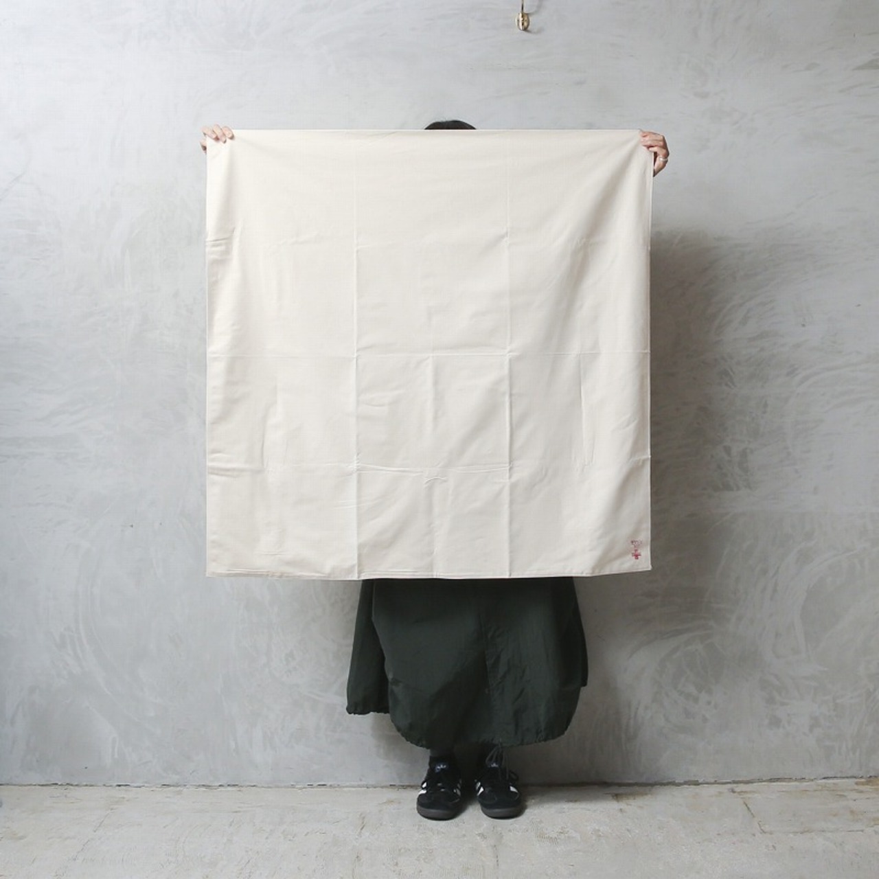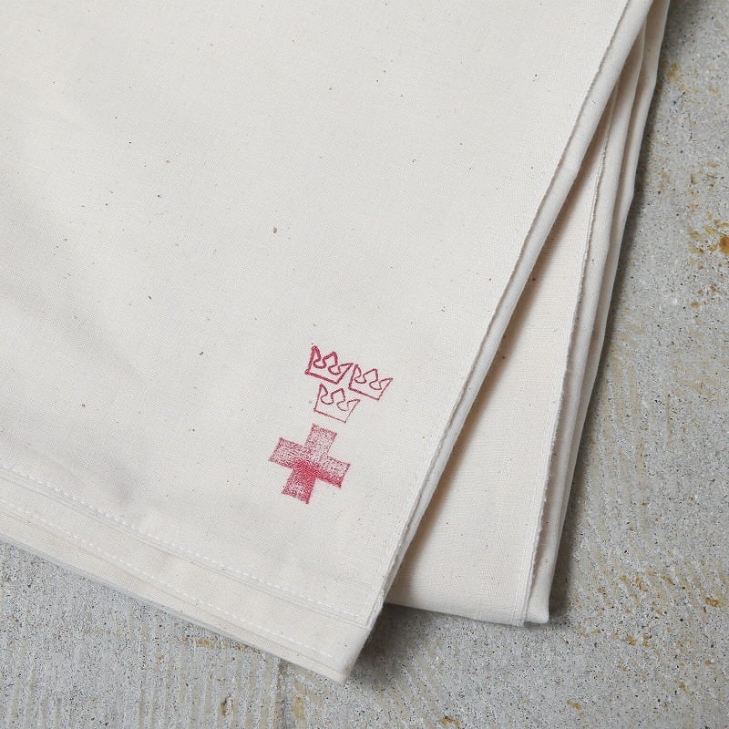 ●スウェーデン軍で採用されていたメディカルシーツです。柔らかい生成りコットンリネン生地を二つ折りにして、縫い合わせています。隅にスウェーデン軍のスリークラウンマークと赤十字のスタンプが押されています。