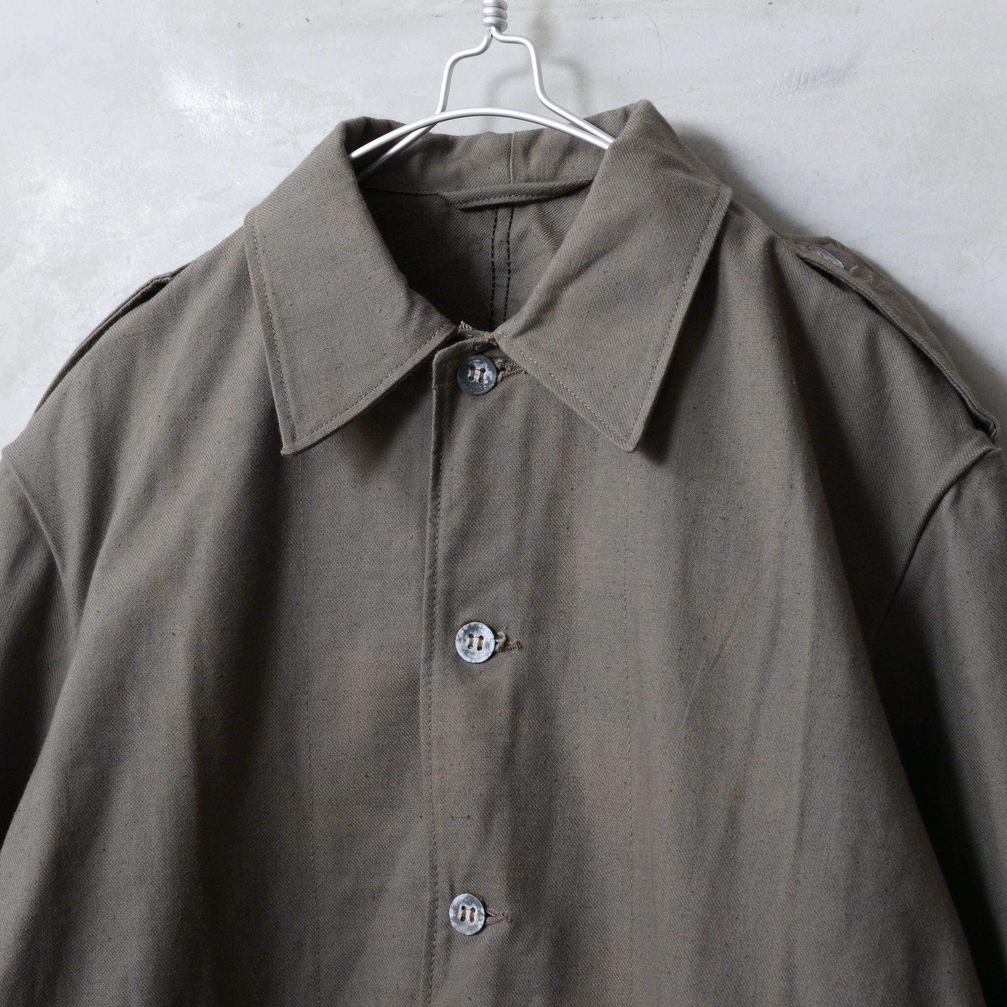 ●1930年代からスウェーデン軍で採用されていたワークジャケットです。茶色がかったオリーブのコットンツイル生地で、フロントのウエスト付近にはフラップのないシンプルなポケット。フロントおよび袖口には、この年代のスウェーデン軍アイテムの特徴であるメタル製ボタンがついています。カバーオール感覚でさらっと羽織っていただけるジャケットです。
